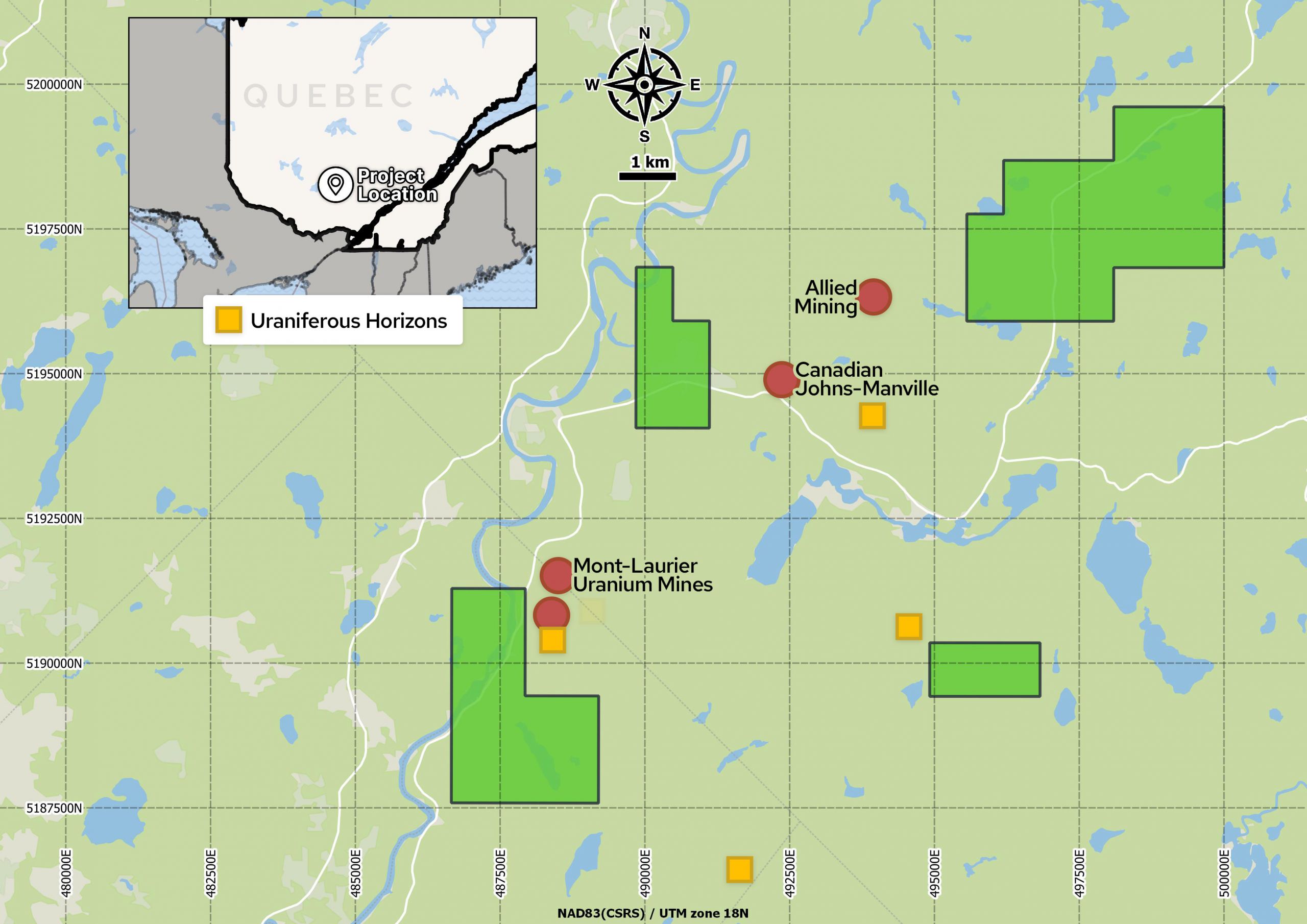 The Mont-Laurier Uranium Property totals 2,353 ha is located approximately 40 kilometres northeast of the town of Mont-Laurier in the Laurentides region of Quebec. The property is easily accessible via the Pérodeau road, which bisects the property and follows the east side of the Lièvre river. The Pérodeau road is paved for 6.6 kilometres up to the western limit of the claim block and then turns into a well-maintained gravel road.