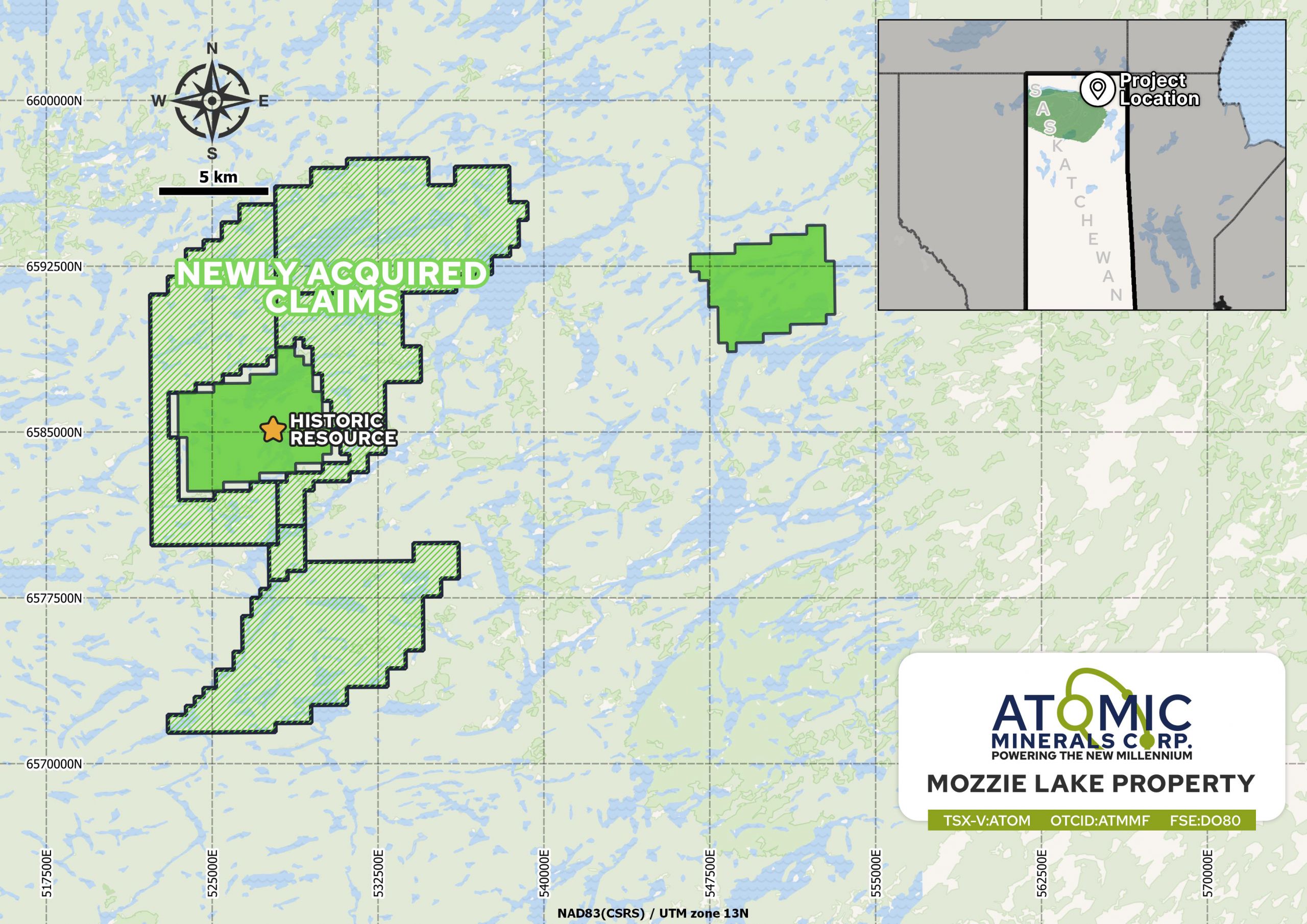 - Atomic’s 26,073.5ha Mozzie Lake Project lies in the basement rock, north of sandstone cover