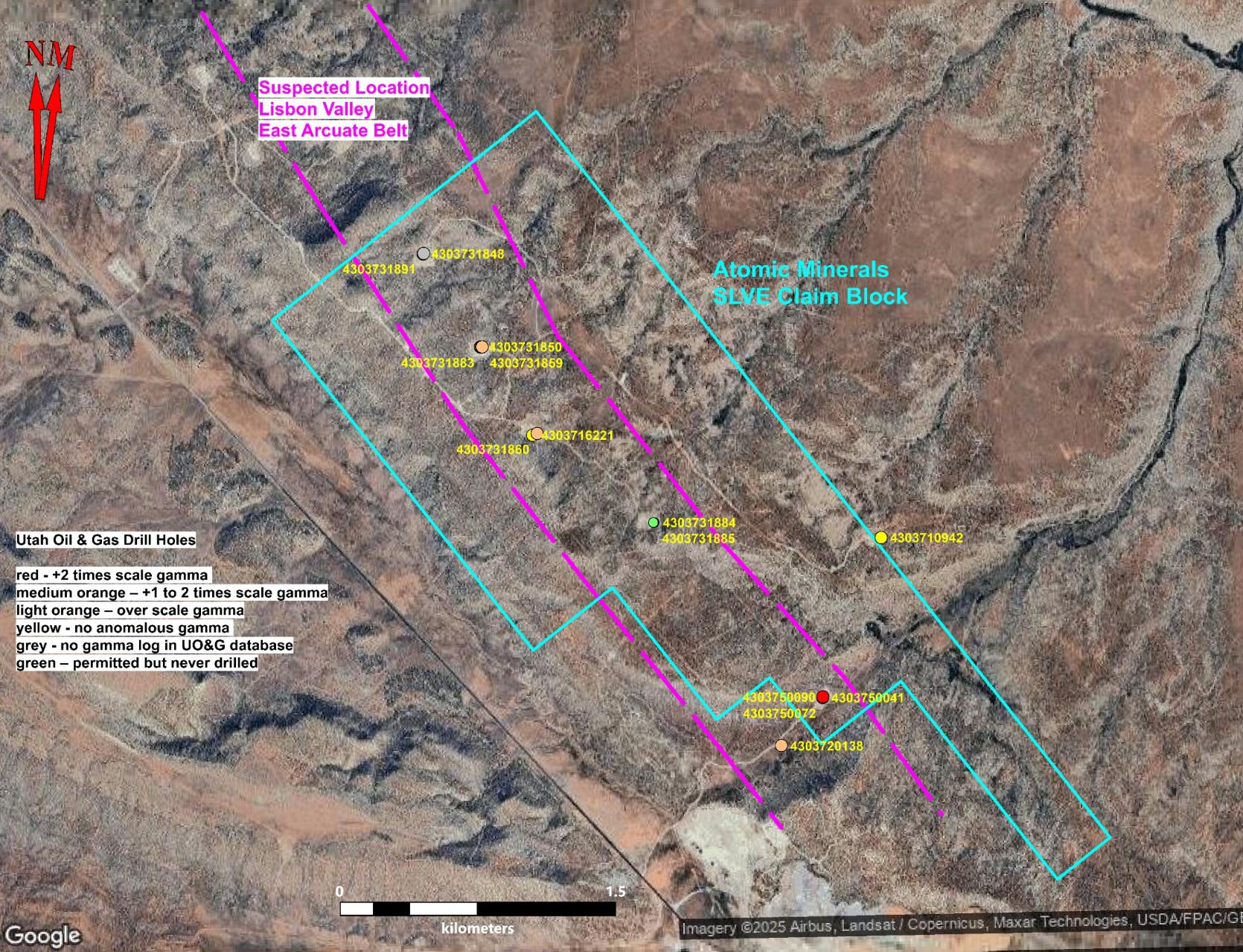Atomic Minerals controls mineral rights across the southern part (about 30%) of a curved zone that earlier oil and gas drilling suggests may contain a significant underground geological feature.