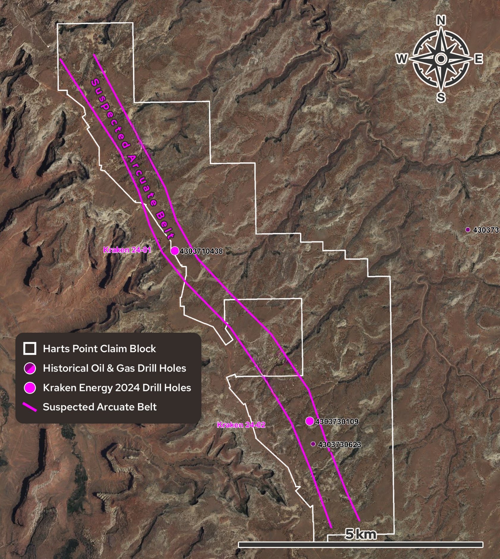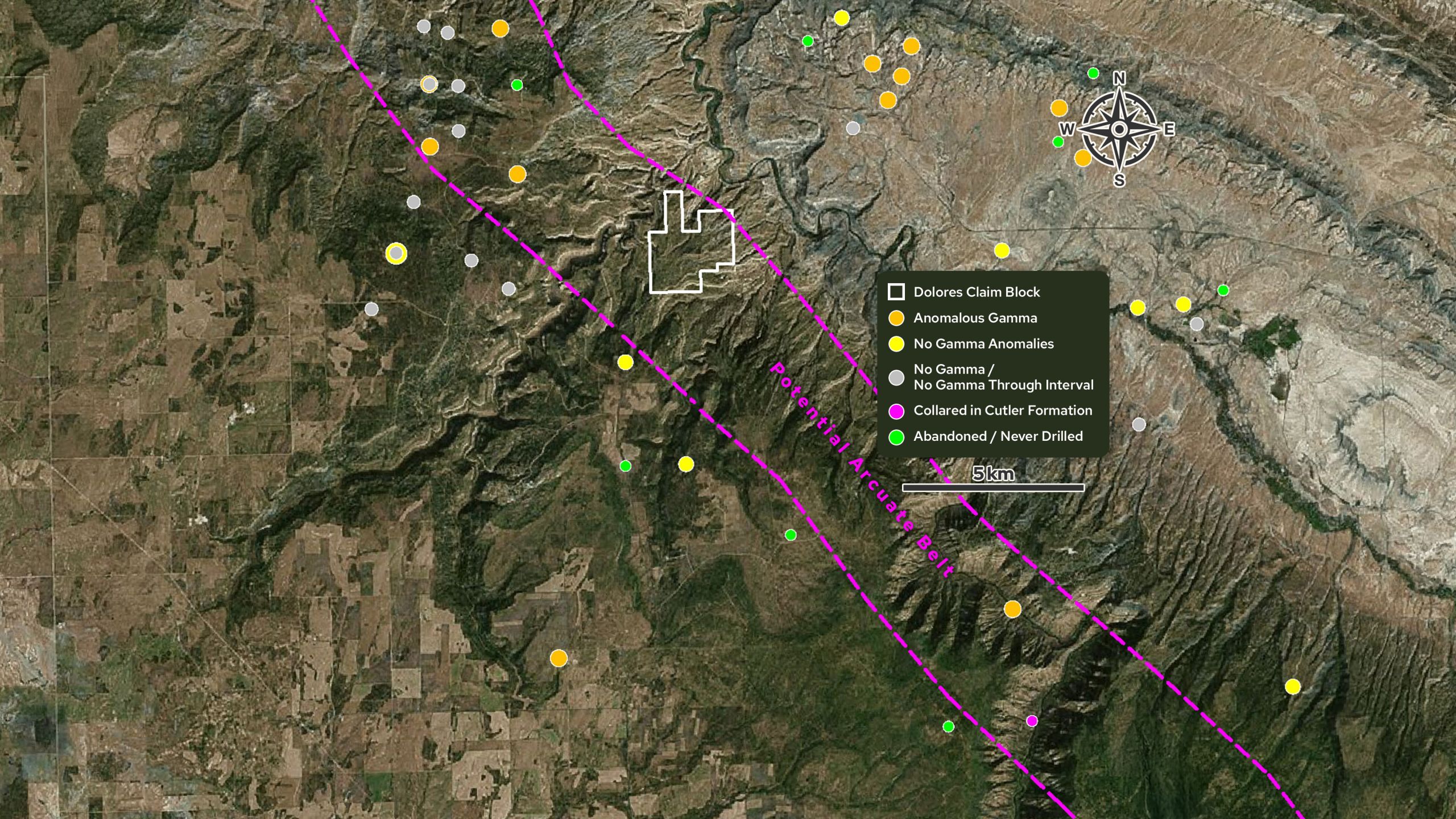 The Harts Point Project consists of 324 claims and covers the flank of the Harts Point anticline, approximately 40 miles by road west of Energy Fuels Inc.’s White Mesa Mill uranium processing facility. Three historic oil and gas holes drilled approximately 2.8 miles apart all located gamma ray log anomalies within the basal portion of the Chinle Formation.