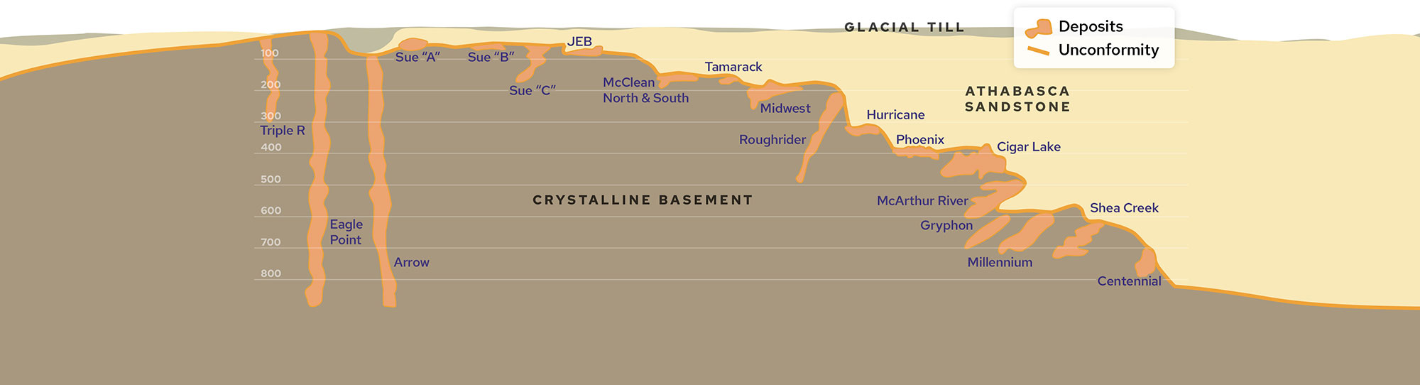 - In the underlying basement rock, both under and outside of the sandstone cover: McArthur River, Roughrider; Triple R, Arrow