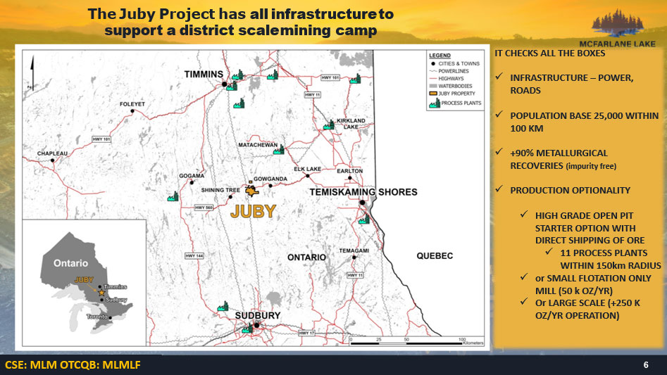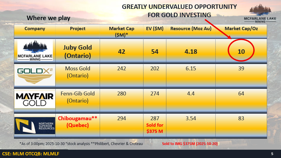 For gold explorers like McFarlane Lake, higher gold prices don’t just improve economics—they transform deposits from those generating 20% margins to over 100% margin, a huge increase in project economics. At current gold prices, McFarlane’s resource sensitivity analysis shows the Juby Gold Project contains the type and quantity of ore associated with major producers. McFarlane’s CEO believes there is potential to attract significant investor or M&A interest from major producers looking to replace depleting reserves.