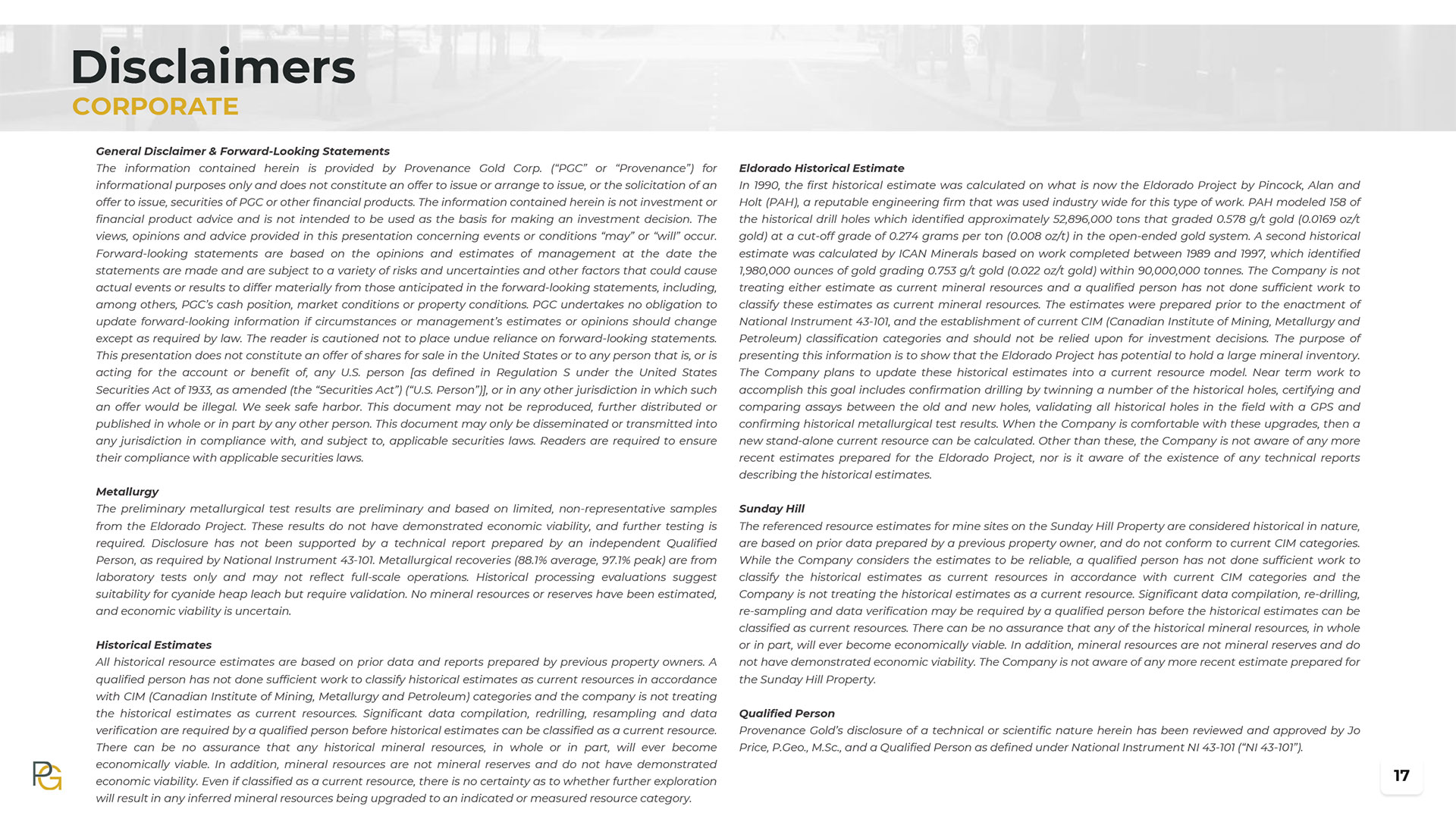 The information contained herein is provided by Provenance Gold Corp. (“PGC” or “Provenance”) for informational purposes only and does not constitute an offer to issue or arrange to issue, or the solicitation of an offer to issue, securities of PGC or other financial products. The information contained herein is not investment or financial product advice and is not intended to be used as the basis for making an investment decision. The views, opinions and advice provided in this presentation concerning events or conditions “may” or “will” occur. Forward-looking statements are based on the opinions and estimates of management at the date the statements are made and are subject to a variety of risks and uncertainties and other factors that could cause actual events or results to differ materially from those anticipated in the forward-looking statements, including, among others, PGC’s cash position, market conditions or property conditions. PGC undertakes no obligation to update forward-looking information if circumstances or management’s estimates or opinions should change except as required by law. The reader is cautioned not to place undue reliance on forward-looking statements. This presentation does not constitute an offer of shares for sale in the United States or to any person that is, or is acting for the account or benefit of, any U.S. person [as defined in Regulation S under the United States Securities Act of 1933, as amended (the “Securities Act”) (“U.S. Person”)], or in any other jurisdiction in which such an offer would be illegal. We seek safe harbor. This document may not be reproduced, further distributed or published in whole or in part by any other person. This document may only be disseminated or transmitted into any jurisdiction in compliance with, and subject to, applicable securities laws. Readers are required to ensure their compliance with applicable securities laws.