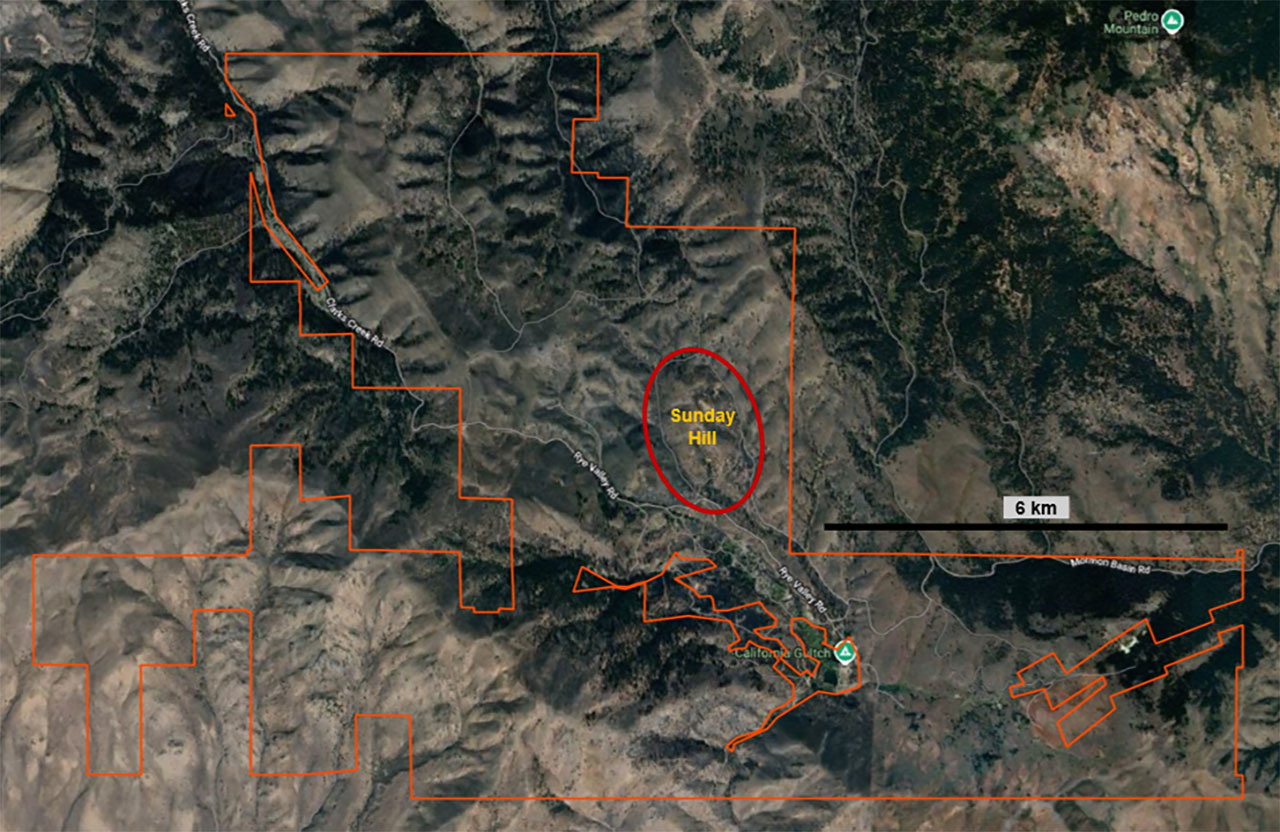 The Eldorado East addition increased the size of the land package by approx. 5,867 acres (23.74 km2) through a combination of staking and an option agreement. The property hosts numerous mines and prospects including the historical Sunday Hill Mines.