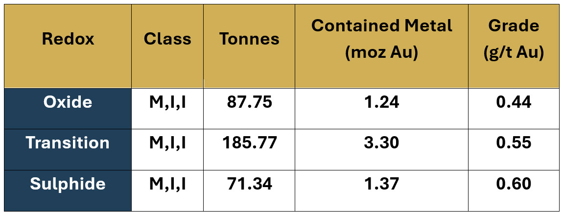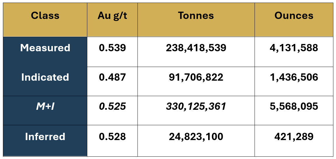| Measured & Indicated | 5.57M oz (238Mt @ 0.539 g/t + 92Mt @ 0.487 g/t) | High-confidence resource base in two categories |