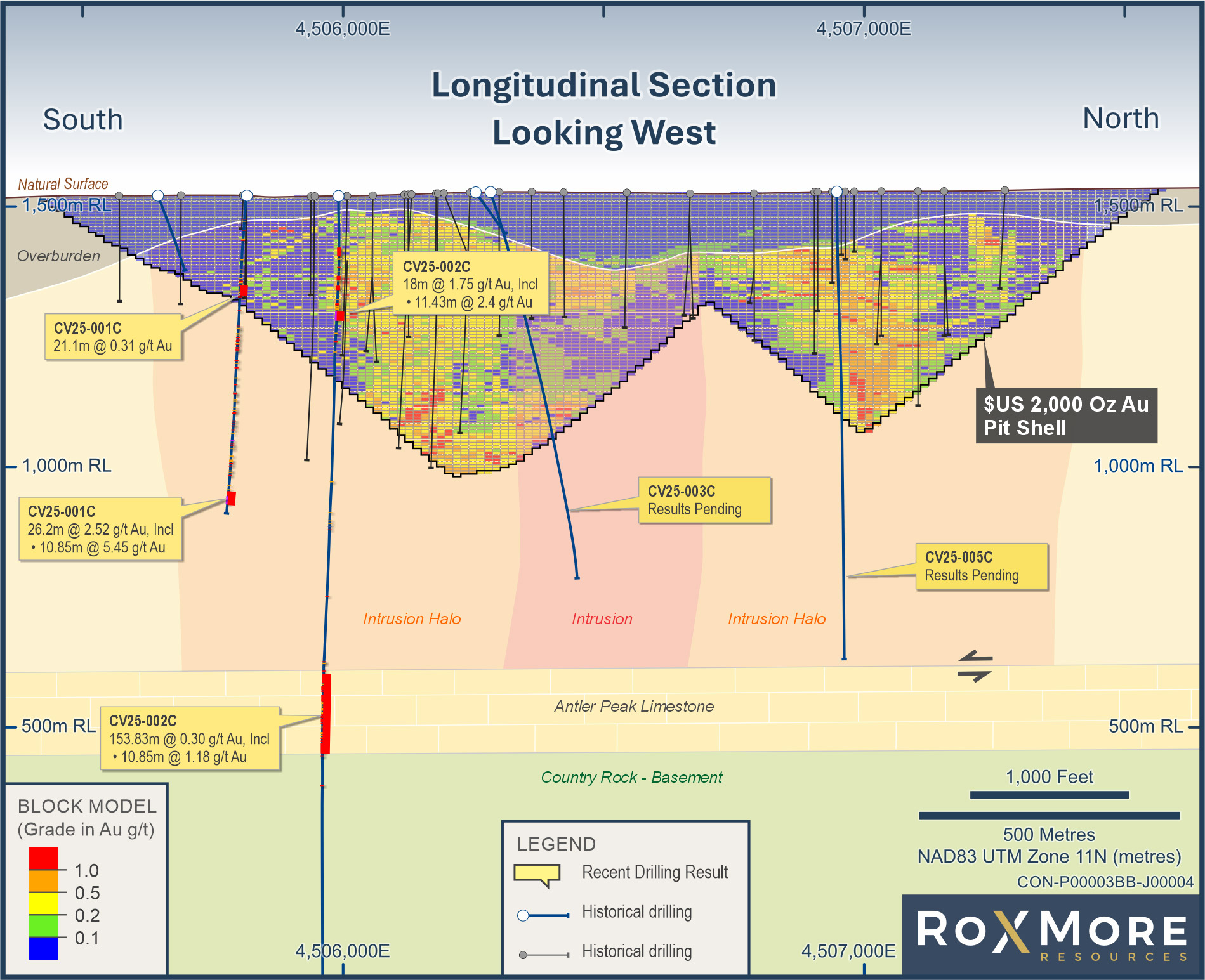 Drilling to date has confirmed strong continuity within the main deposit, but step-out holes and geophysical data suggest additional feeder zones and high-grade structures remain open along trend. Notably, recent drilling intersected 153 meters of continuous gold mineralization at depth within the Antler Peak Limestone—the first confirmation of this reactive host rock on the property and a key indicator for skarn-style mineralization in Nevada.