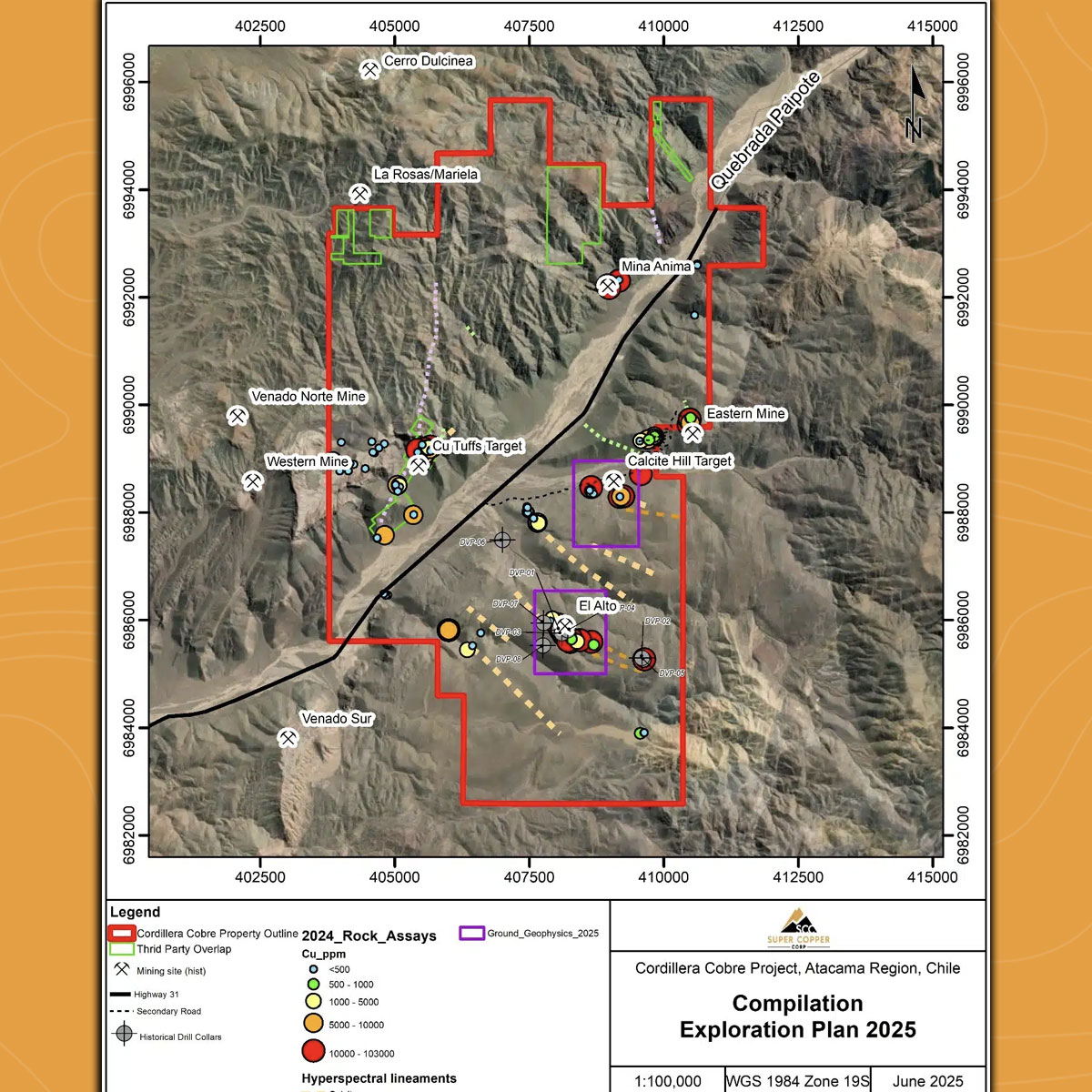Cordillera Cobre News: Super Copper has defined an 800-meter-long copper corridor at Cordillera Cobre with multiple high-intensity chargeability anomalies extending over 400 meters vertically, and entirely untested by drilling. Historical shallow drilling intercepted only the anomaly margins, yet still returned up to 1.6% copper, including 2 meters at 1.605% Cu. The geophysical data now reveals where the core of this sulphide system lies, and the company is fully funded to test these high-priority targets during its Q2 2026 diamond drilling program.