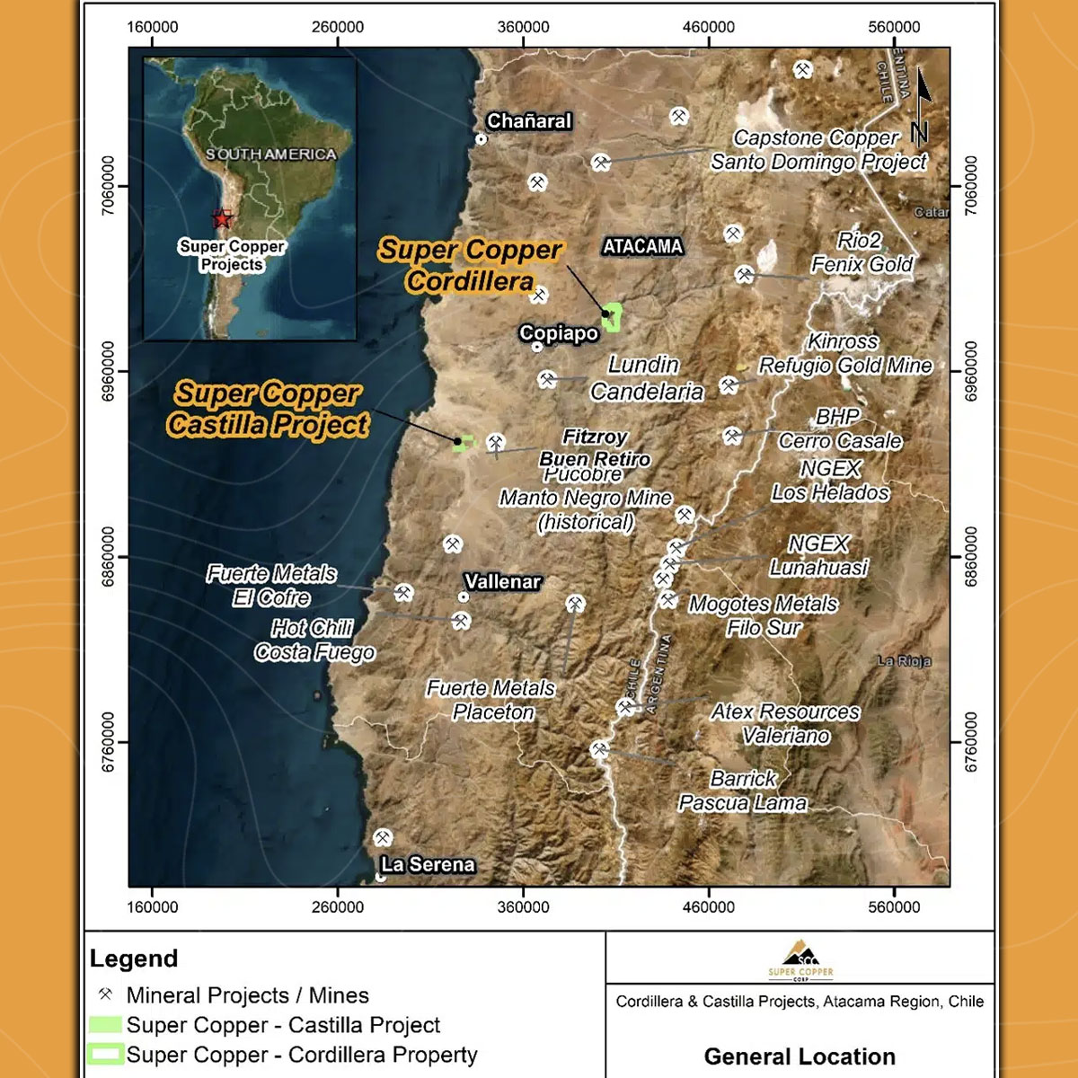 Super Copper Corp. is exploring more than 12,000 hectares  across two flagship properties, Cordillera Cobre and Castilla, that are positioned alongside some of the world’s most productive copper mines.